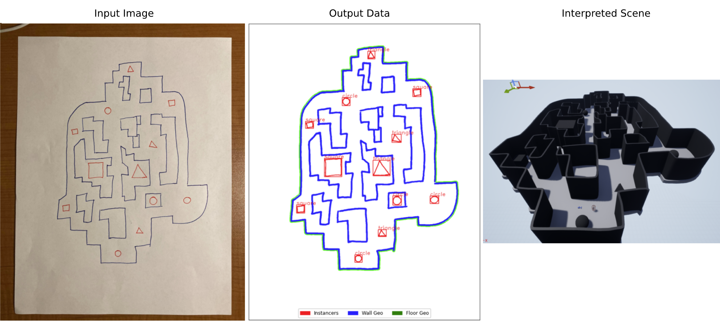 An image of a top-down level layout drawing is converted to a graybox level as such. First, relevant data is extracted from the image such as level contours and instancer object bounding boxes. Secondly, 3D static level geometry and instance points are generated from that data. Thirdly, static level geometry is processed and actors are transformed to the instance points and scaled appropriately. This whole process is packaged into the game engine such that the level designer only needs to specify a filepath to their input image and tune relevant parameters such as wall and floor thickness to generate a graybox level.