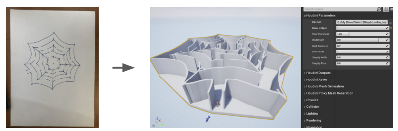 Example of Sketch 2 Graybox results automatically generating level grayboxes from sketches. This approach aims to boost creativity by allowing the designer to instantly playtest their designs and iterate without 3D modeling slowing down the process. It can also save money by speeding up the level design process and allowing artists to begin working on levels earlier in production.